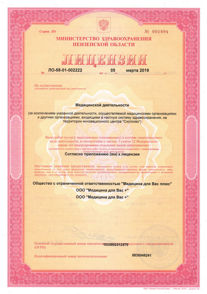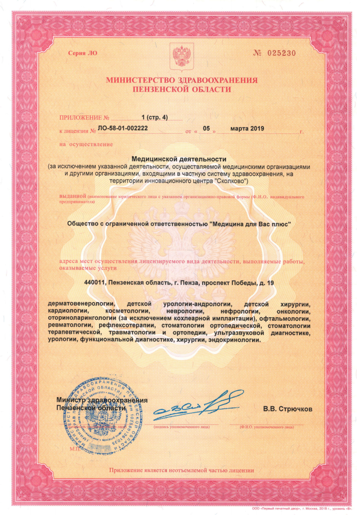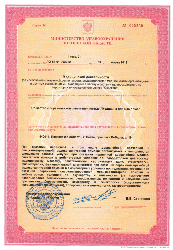 Сеть клиник «Медицина для Вас+» в Пензе, хорошо известная тысячам пациентов, – безусловный гарант высокого качества медицинской помощи. Этому способствует ряд факторов, и в числе приоритетных – оснащенность новейшим оборудованием и высокий профессионализм врачей. Здесь работают люди, которые зарекомендовали себя как одни из лучших в своем деле: заслуженные врачи России, кандидаты медицинских наук, врачи высшей и первой категорий. Опытные специалисты, тем не менее, постоянно совершенствуют мастерство, изучая инновационные технологии в медицине. В Пензе действуют уже четыре медицинских центра «Медицина для вас+». В числе приоритетных направлений деятельности - семейная медицина: клиника обеспечивает комплексное наблюдение детей от рождения до 14 лет. Клиника обеспечивает комплексную консультативную и лечебную помощь специалистов терапевтического и хирургического профилей по двум десяткам направлений: терапии и кардиологии, гастроэнтерологии и эндокринологии, аллергологии и дерматологии, хирургии и урологии, гинекологии и онкологии. Пройти исследования и необходимые процедуры можно в кабинетах лабораторной, лучевой, ультразвуковой и функциональной диагностики, эндоскопических исследований, физиотерапии. Для большего удобства пациентов в клинике оборудован дневной стационар. К услугам пациентов профессиональная терапевтическая и хирургическая косметология. Стоматология «Медицина для Вас+» предлагает весь спектр услуг терапевтической стоматологии.